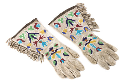 partially beaded with floral and foliate motifs and a brown cloth trim.