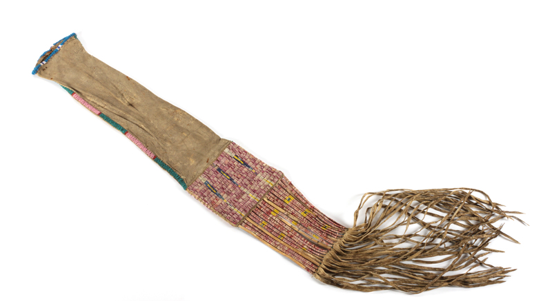 the upper hide decorated with colored beads including blue, white, green, red and pink above the two sided quill panel and hide fringe.