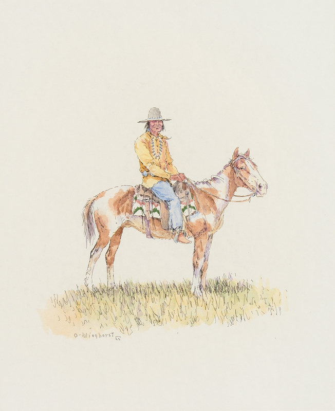 Indian in Hat on Horseback, watercolor and ink, signed O-Wieghorst (lower left)