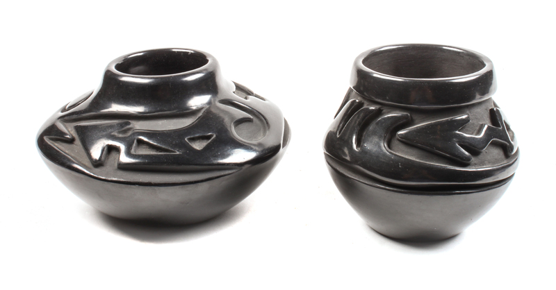 one by Madeline Naranjo (b. 1916) with carved Avanyu design, signed Madeline N, Santa Clara Pueblo and another by Teresita Naranjo (1919-1999) also with carved Avanyu design, signed Teresita Naranjo, Santa Clara Pueblo