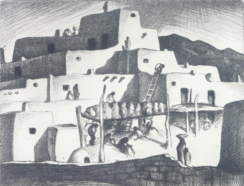 Pueblo Harvest Time, etching, signed Gene Kloss (lower right)