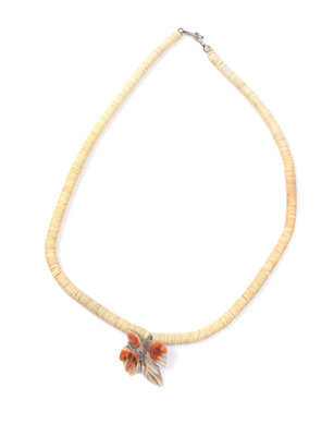 the white heishi necklace having a single carved bird fetish, an attached old paper tag attributes the necklace to Leekya Deyuse.