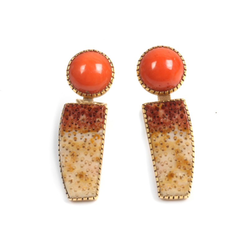 Gail Bird (b. 1949) and Yazzie Johnson (b. 1946), Pair of 18 Karat Yellow Gold and Coral Earclips
