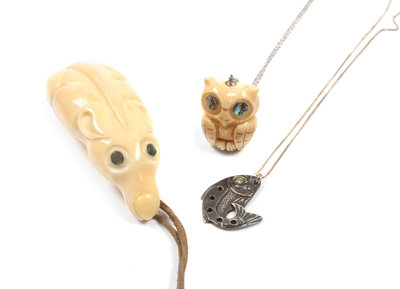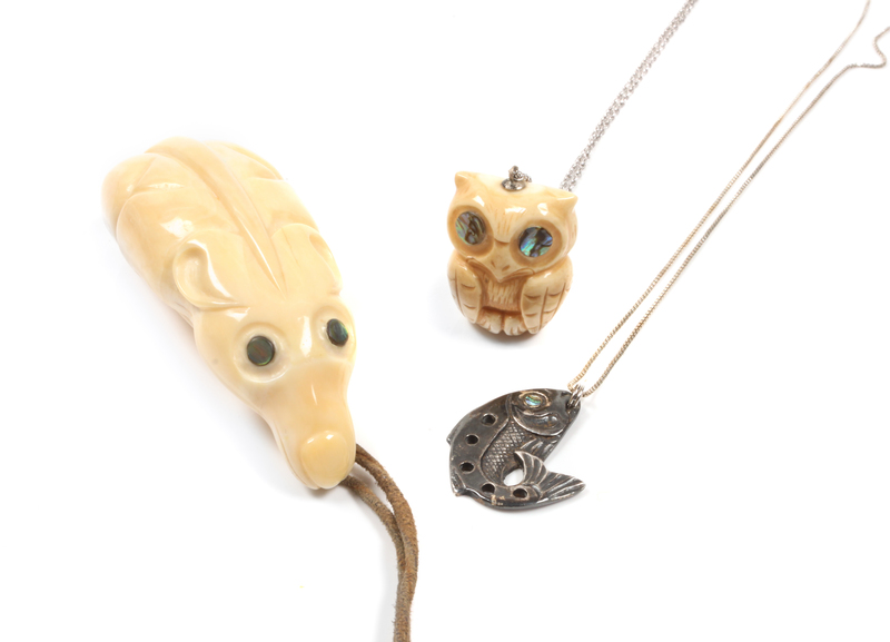 two pendants carved fossilized ivory with mother of pearl inlay, one depicting an owl and the other a mouse, the third pendant silver with mother of pearl inlay depicting a fish, each signed Patty Fawn.