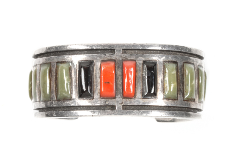 the silver inlaid with rectangular turquoise, red coral and onyx stones by stamped with a conjoined JR.