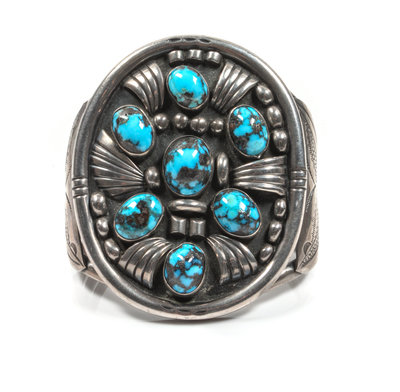 the bracelet set with seven turquoise stones, possibly Bisbee, and applied silver design, stamped Phil T.