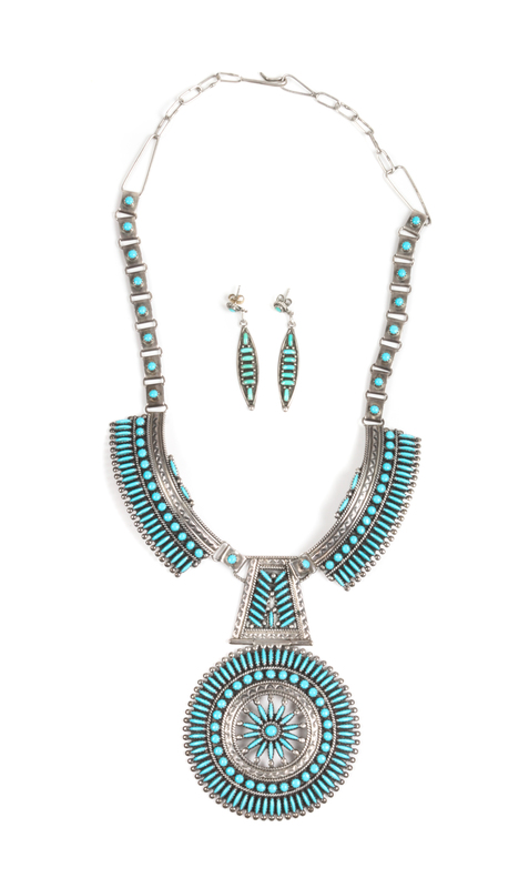 the pendant stamped F.M. Begay, Navajo, Sterling, together with a pair of Zuni needlepoint earrings by Ellen Lonasee (b. 1935) stamped E L Lonasee.