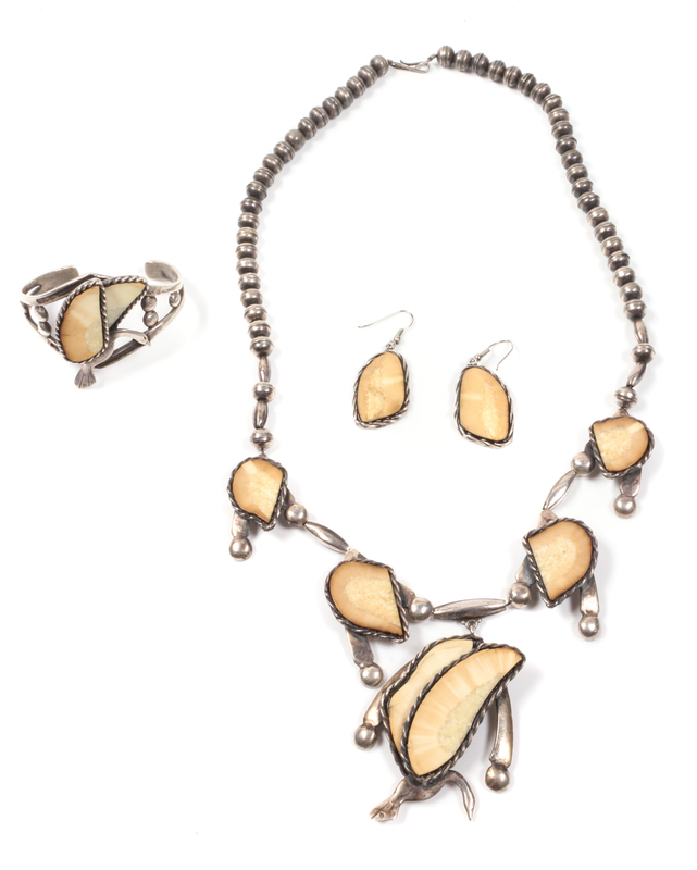 Fossilized Walrus Ivory and Silver Necklace, Earrings and Bracelet