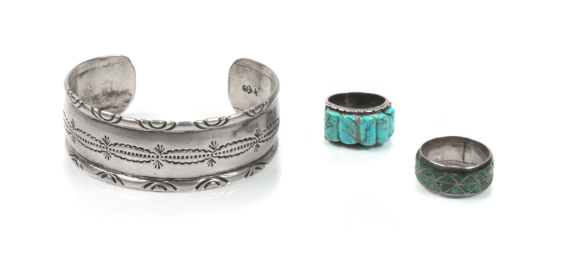 marked for the Carl W. Luthey shop, together with two southwestern silver and turquoise rings.
