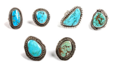Six Southwestern Silver and Turquoise Rings
