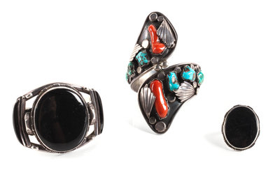 one having coral and turquoise stones, the second with three black onyx stones, together with a matching ring.