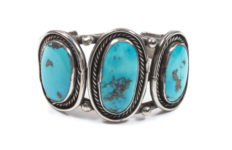 having three turquoise stones.