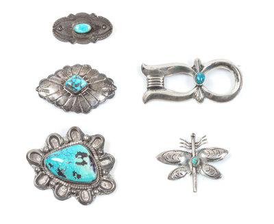 Five Southwestern Silver and Turquoise Brooches