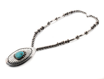 the oval pendant having a single turquoise cabochon on a silver bead necklace.
