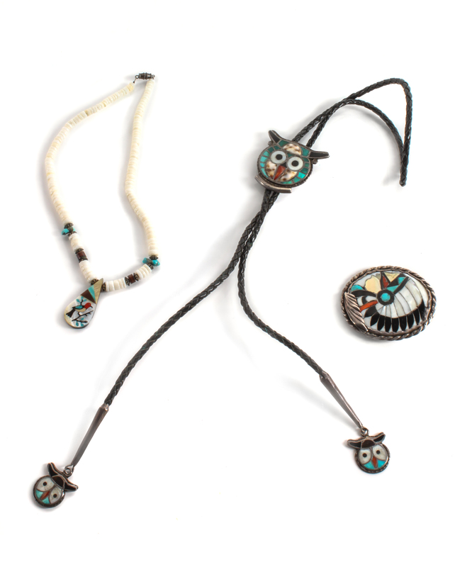 comprising an owl bolo with matching tips, an inlaid pending depicting a bird on a heishi shell necklace and a brooch inlaid to depicting a figure in profile
