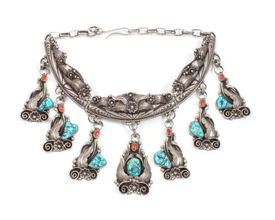 Navajo Silver, Turquoise and Coral Choker Necklace