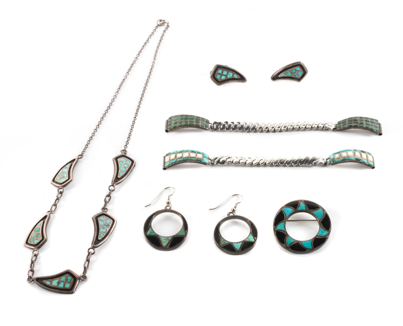 comprising a silver and turquoise necklace with matching earrings, a silver turquoise and jet brooch with matching earrings and two watch bands