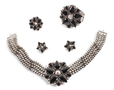 comprising a necklace, cuff bracelet, ring and pair of earrings, all with matching flower motif designs.