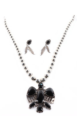 depicting a bird on a silver bead chain, together with a pair of earrings.