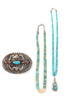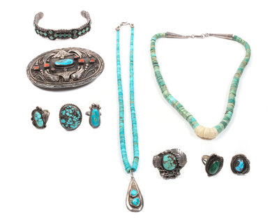 comprising a Navajo silver, turquoise and coral belt buckle, two turquoise Heishi necklace, one with silver pendant, a silver turquoise bracelet and six Navajo silver and turquoise rings. 10 total.