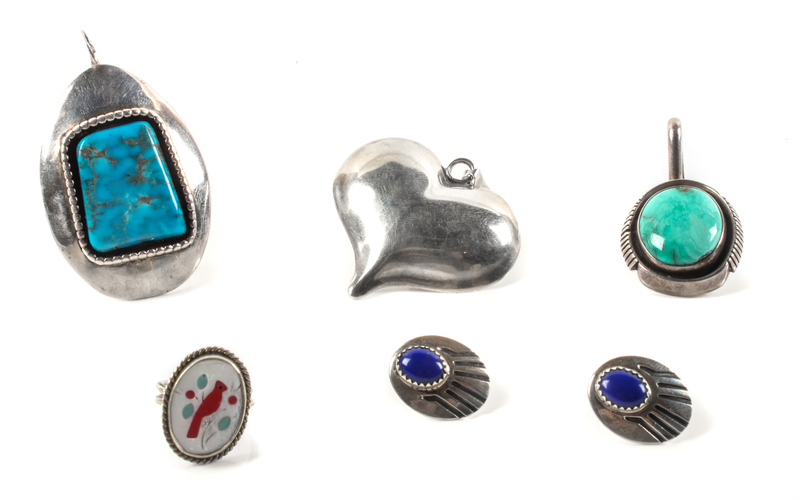 including a pair of silver and lapis earrings, three pendants and an inlaid ring.