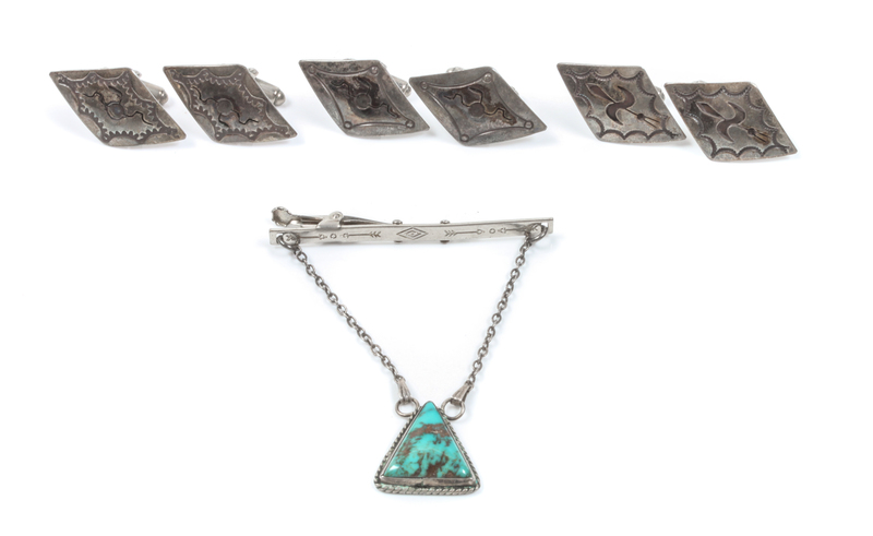 comprising three pairs of silver cuff links and a silver and turquoise tie clip.