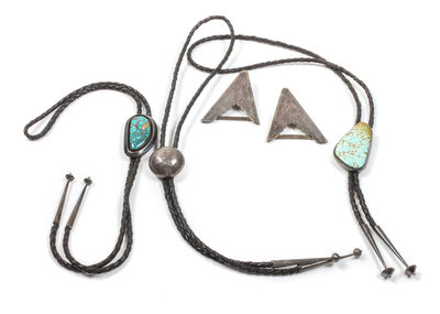 two having single turquoise stone, together with a pair of silver collar tips.