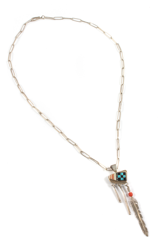 reversible, one side with single turquoise stone, the other with multiple stone mosaic inlay, on a silver link chain, etched Romero on the side.