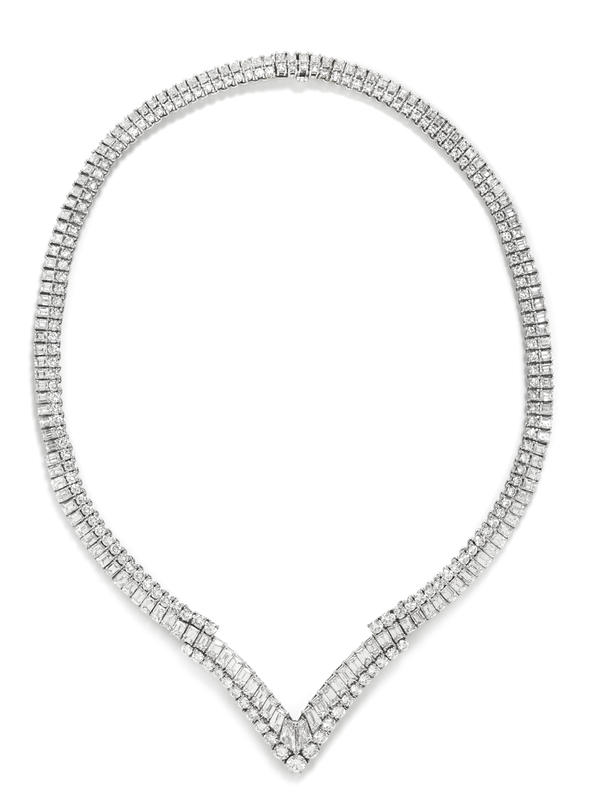 containing two trapezoid mixed cut diamonds weighing approximately 1.50 carats total, 144 baguette cut diamonds weighing approximately 22.00 carats total and 151 round brilliant cut diamonds weighing approximately 18.00 carats total, with central hidden hook for pendant suspension. Stamp: ZV 18K EUROPEAN JEWELLERY.
