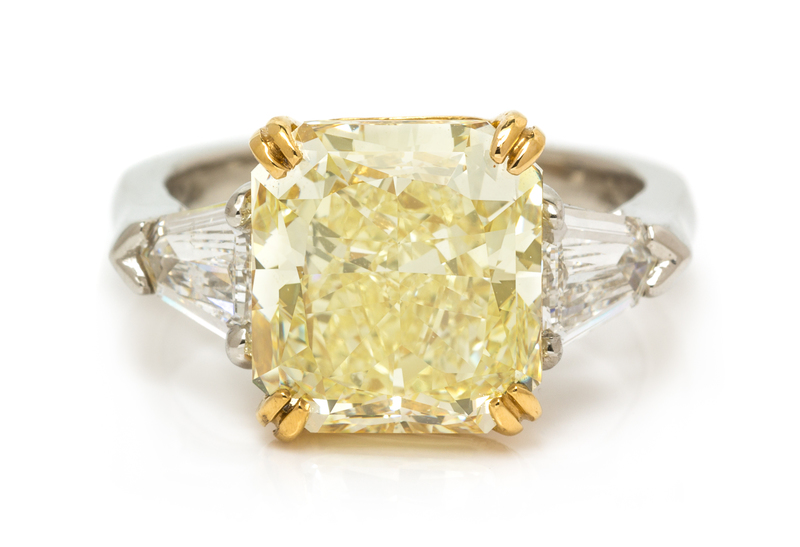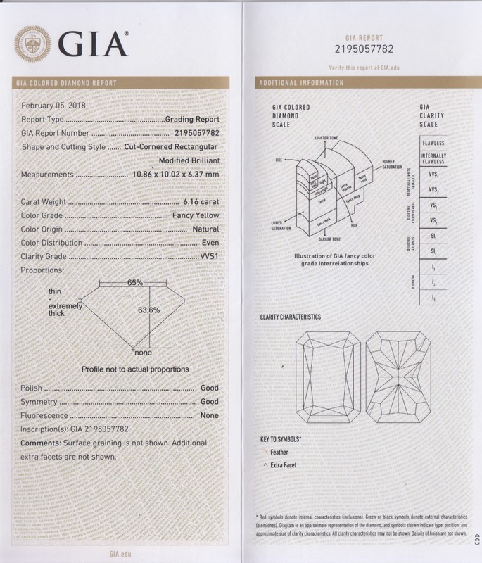 containing one radiant cut fancy yellow diamond weighing 6.16 carats and two shield shape step cut diamonds weighing approximately 0.33 carat total.Stamp: PLAT 22K.Accompanied by a Gemological Institute of America colored diamond grading certificate number 2195057782, dated February 5, 2018, stating Color: Natural Fancy Yellow, Clarity: VVS1, Polish: Good, Symmetry: Good, Fluorescence: None, Inscription: GIA 2195057782.