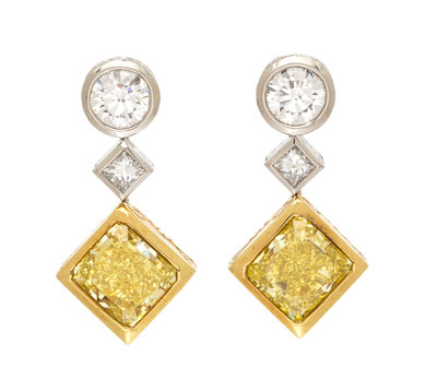 A Pair of Platinum, 18 Karat Yellow Gold, Fancy Vivid Yellow and Fancy Intense Yellow Diamond Earrings, Michael Beaudry,