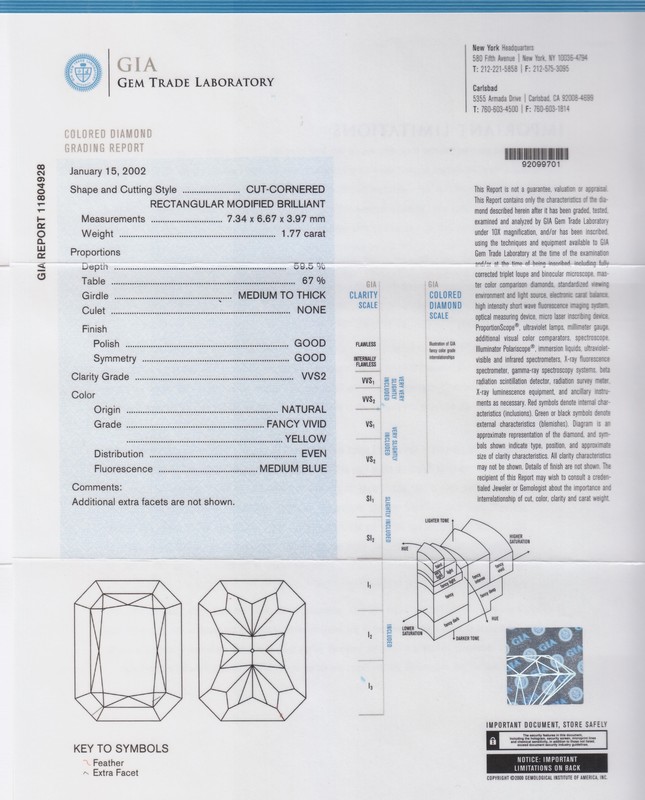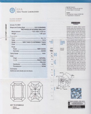 containing one radiant cut fancy yellow diamond weighing 1.77 carats, one radiant cut fancy yellow diamond weighing 1.90 carats, two round brilliant cut diamonds weighing approximately 0.80 carat total and two princess cut diamonds weighing approximately 0.20 carat total.Stamp: BEAUDRY 750 PLAT.Accompanied by a Gemological Institute of America colored diamond grading certificate number 11804928, dated January 15, 2002, stating Color: Natural, Fancy Vivid Yellow, Even, Clarity: VVS2, Polish: Good, Symmetry: Good, Fluorescence: Medium Blue.Accompanied by a Gemological Institute of America colored diamond grading certificate number 11390487, dated January 12, 2001, stating Color: Natural, Fancy Intense Yellow, Even, Clarity: VVS1, Polish: Very Good, Symmetry: Good, Fluorescence: None.