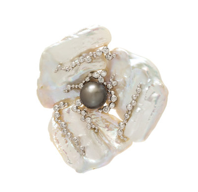 An 18 Karat White Gold, Cultured Keshi Pearl, Cultured Tahitian Pearl and Diamond Floral Pendant/Brooch, Kai-Yin Lo,
