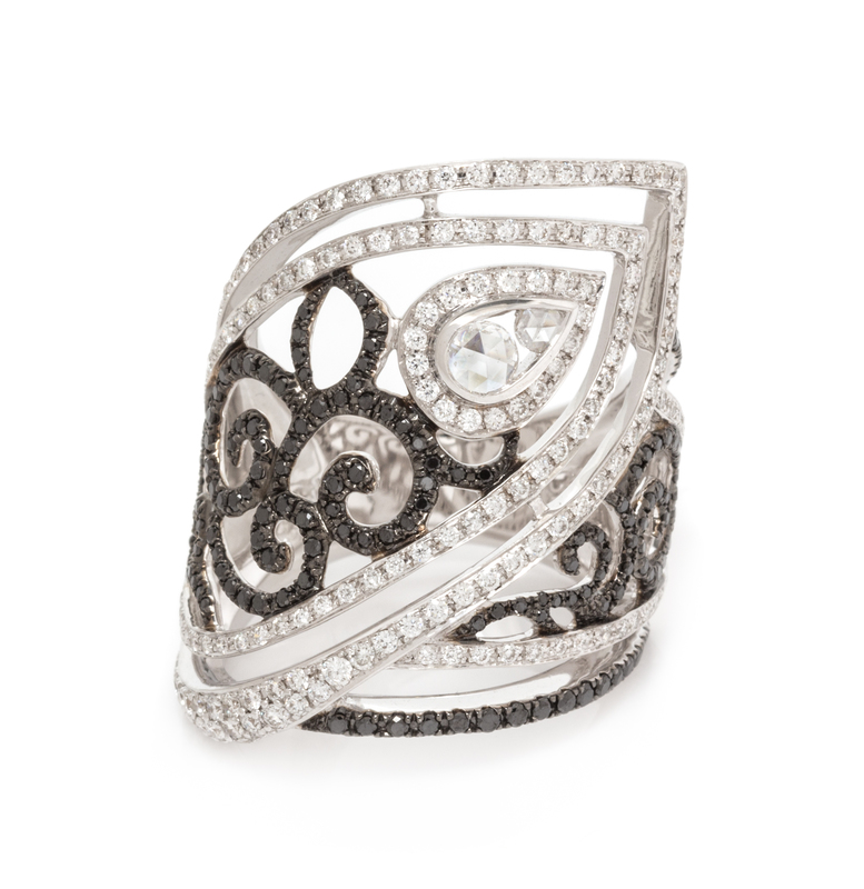 containing two round rose cut diamonds weighing approximately 0.10 carat total, 171 round brilliant cut diamonds weighing approximately 0.88 carat total and 148 round brilliant cut black diamonds (origin of color not tested) weighing approximately 0.54 carat total in a swirling openwork design.Stamp: 750.