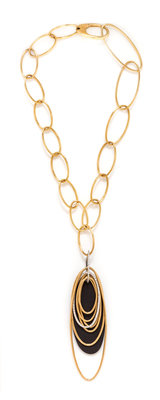 consisting of detachable pendant with removable oval yellow and white gold links containing numerous round brilliant cut diamonds weighing approximately 1.50 carats total together with an oval matte onyx plaque, pendant is suspended from an oval link necklace of graduating size with oversized lobster claw clasp.Stamp: MATTIOLI 750 (Italian hallmark).
