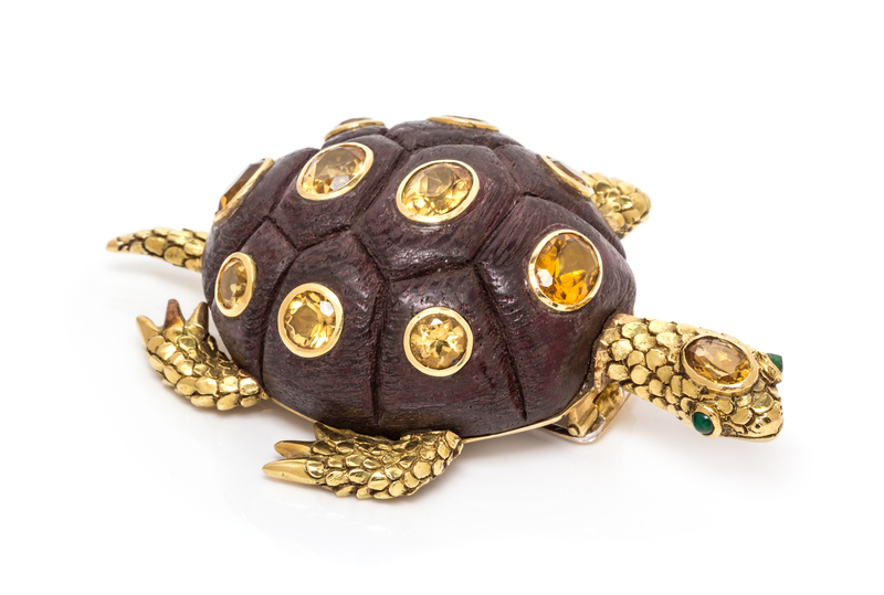 An 18 Karat Yellow Gold, Wood, Citrine and Emerald Turtle Brooch, Seaman Schepps,