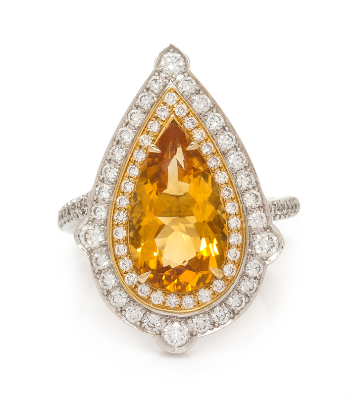 containing one pear shape mixed cut citrine weighing approximately 3.77 carats and 79 round brilliant cut diamonds weighing approximately 0.99 carat total.Stamp: 750.