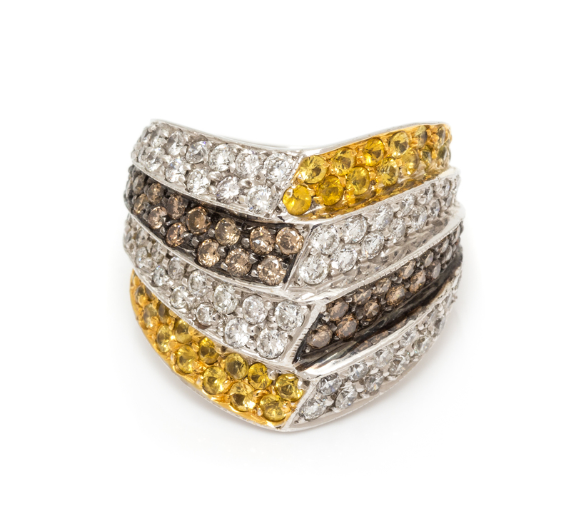 consisting of a chevron design of alternating bands containing 67 round brilliant cut diamonds weighing approximately 1.30 carats total, 33 round brilliant cut yellow colored diamonds (origin of color not tested) weighing approximately 0.50 carat total and 33 round brilliant cut brown colored diamonds (origin of color not tested) weighing approximately 0.50 carat total.Stamp: 18K.