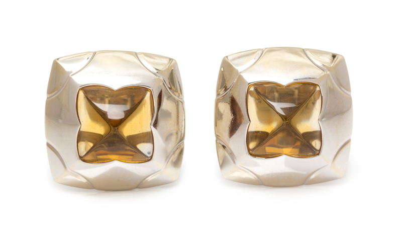 containing two sugarloaf shape cabochon cut citrines measuring approximately 12.00 x 12.00 mm within sculpted surround measuring approximately 27.00 x 27.00 mm.Stamp: BVLGARI 750 MADE IN ITALY (Italian hallmark).