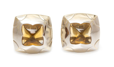 A Pair of 18 Karat White Gold and Citrine 'Pyramid' Earclips, Bvlgari,