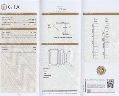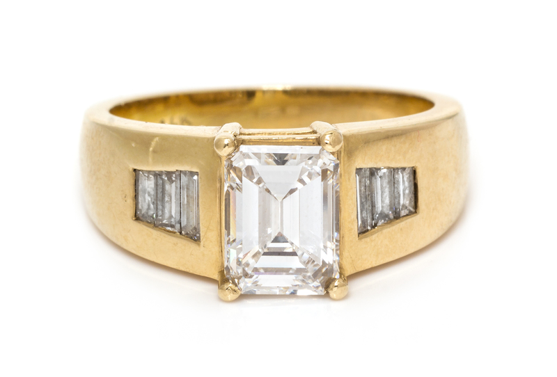 containing one octagonal step cut diamond weighing 1.81 carats and six tapered baguette diamonds weighing approximately 0.25 carat total.Stamp: 14K.Accompanied by a Gemological Institute of America diamond grading certificate number 2195752043, dated October 17, 2018, stating Color: D, Clarity: VS1, Polish: Good, Symmetry: Good, Fluorescence: None.