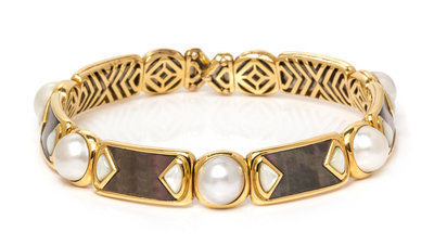 consisting of a semi-flexible design consisting of seven mabe pearls measuring approximately 13.00 mm in diameter alternating with mother-of-pearl and abalone sections.Stamp: Marina B. OR 750 FRANCE 18K A79 MB.