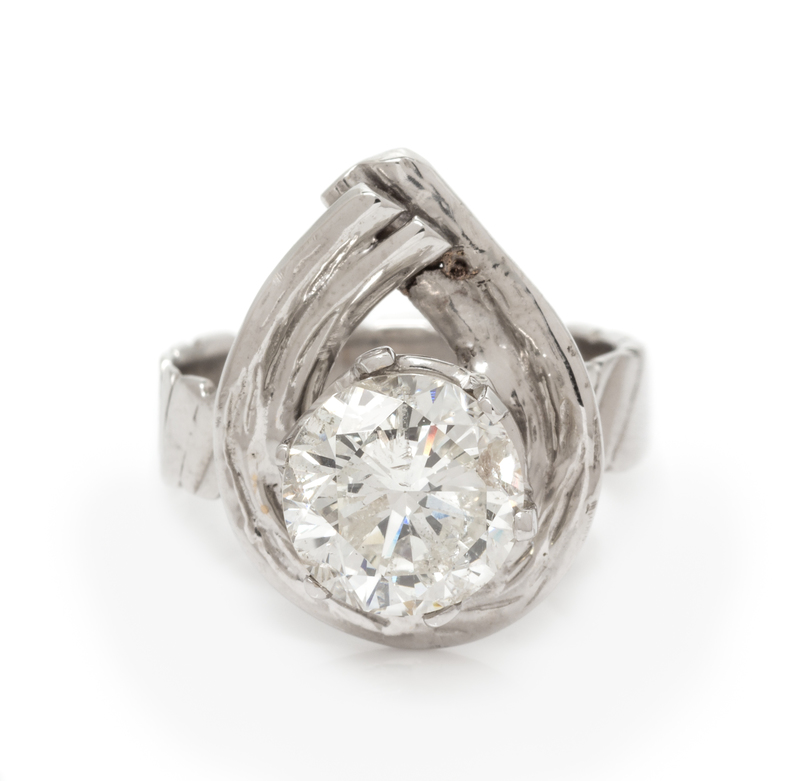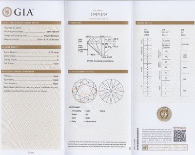containing one round brilliant cut diamond weighing 2.73 carats.Stamp: (partially obscured)4K.Accompanied by a Gemological Institute of America diamond grading certificate number 2195715709, dated October 4, 2018, stating Color: K, Clarity: I2, Cut: Good, Polish: Good, Symmetry: Good, Fluorescence: None.