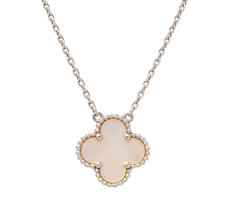 containing one quatrefoil shape mother-of-pearl plaque measuring approximately 12.86 x 12.53 mm within a beaded surround, suspended from a cable link chain.Stamp: VCA Au750 JB252460.Accompanied by a necklace folder signed Van Cleef & Arpels.