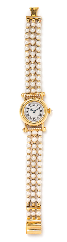 the lugs and crown containing 19 round brilliant cut diamonds weighing approximately 0.26 carat total, 20.00 mm case diameter, mother-of-pearl dial signed CARTIER with secret signature at 10 o'clock, Roman numerals, blued steel Breguet hands, case back affixed with six screws, quartz movement, triple strand gold and pearl bracelet, gold clasp.Case back stamp: Cartier WATER RESISTANT SWISS MADE 18K 1471 C89727 (Swiss hallmark) 750.Accompanied by a red pouch signed Cartier.