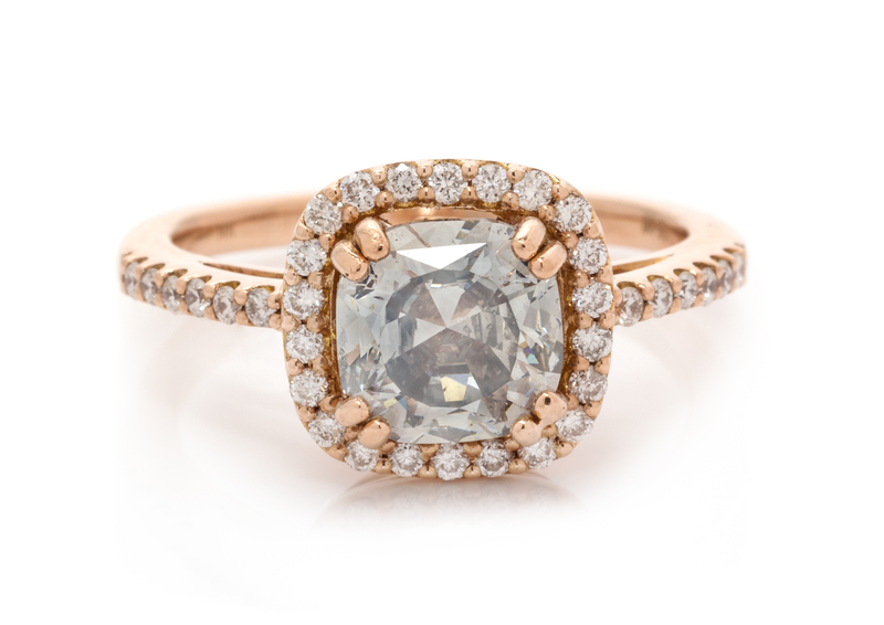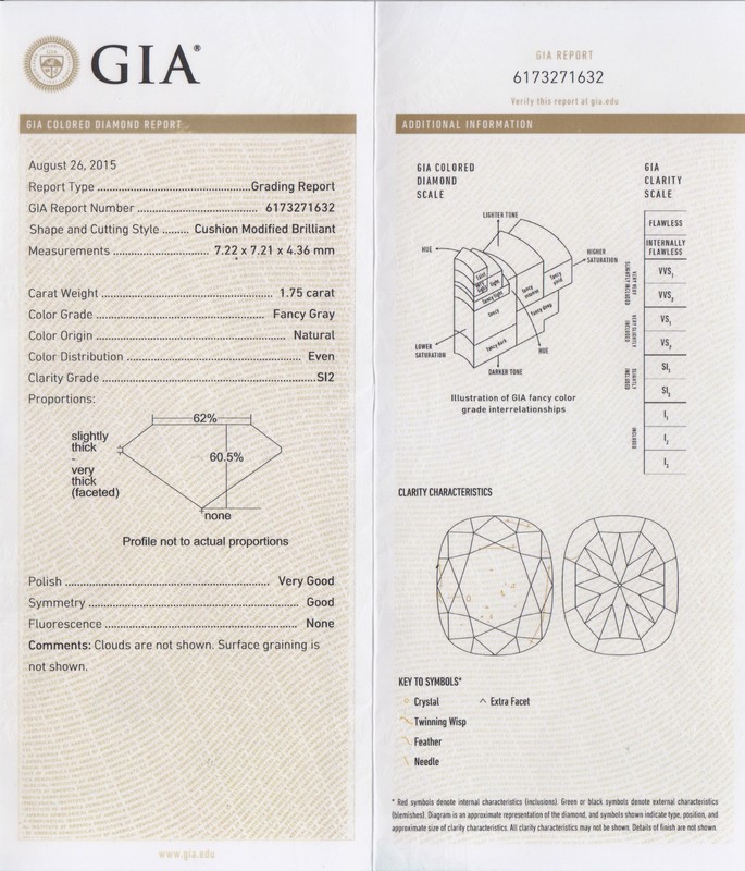 containing one cushion shape modified brilliant cut diamond weighing 1.75 carats and 34 round brilliant cut diamonds weighing approximately 0.24 carat total.Stamp: 14K DO-33.Accompanied by a Gemological Institute of America colored diamond grading certificate number 6173271632, dated August 26, 2015, stating Color: Natural, Fancy Gray, Even, Clarity: SI2, Polish: Very Good, Symmetry: Good, Fluorescence: None.