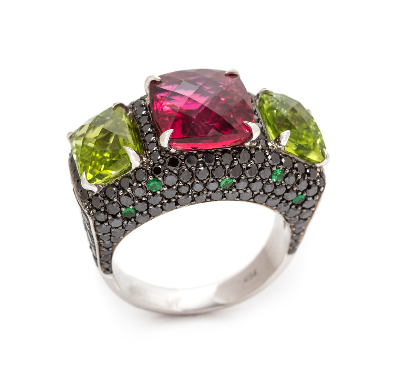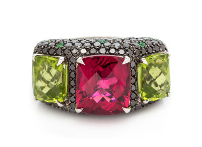 An 18 Karat White Gold, Pink Tourmaline, Peridot, Black Diamond and Tsavorite Garnet Ring,