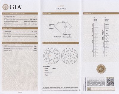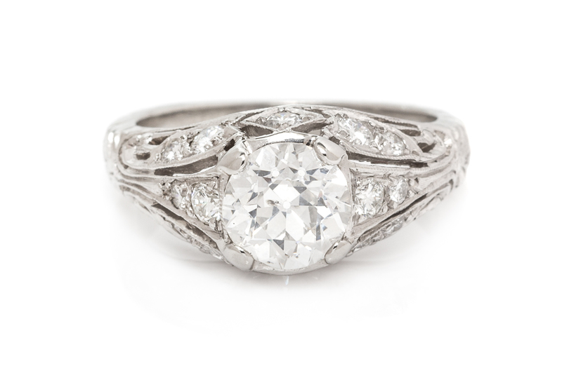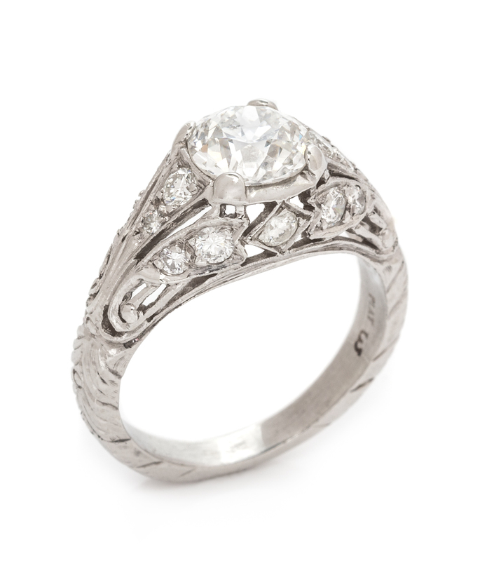 containing one old European cut diamond weighing 1.25 carats and 14 round brilliant cut diamonds weighing approximately 0.47 carat total.Stamp: PLAT (maker's mark for Whitehouse Brothers).Accompanied by a Gemological Institute of America diamond grading certificate number 1182914479, dated December 7, 2017, stating Color: F, Clarity: SI2, Polish: Fair, Symmetry: Fair, Fluorescence: None.
