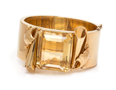 A Retro Yellow Gold and Citrine Bangle Bracelet,