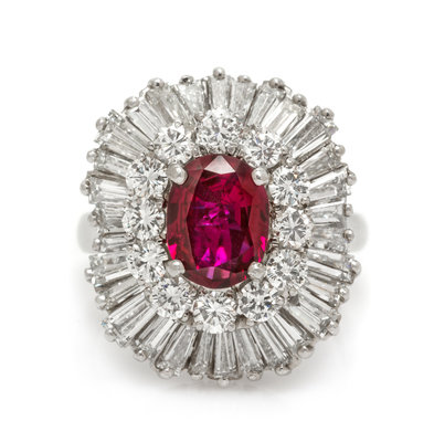 containing one oval mixed cut ruby weighing approximately 1.30 carats, 12 round brilliant cut diamonds weighing approximately 0.72 carat total and 30 tapered baguette cut diamond weighing approximately 0.85 carat total, the central portion of the ring detaches and can be worn as a pendant.Stamp: 10% IRID PLAT RING-DANT PALAIS PATENDED.